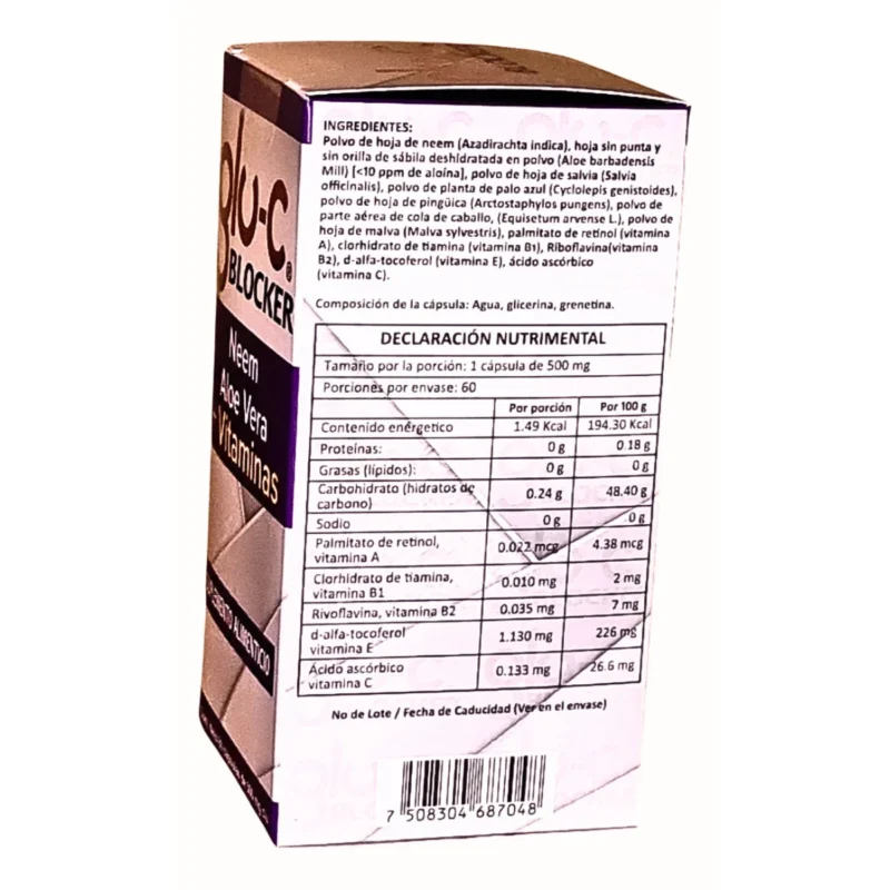 El Glu-C Blocker ( antes llamado Gluco Blocker ) es un suplemento alimenticio formulado con una mezcla única de extractos naturales y vitaminas esenciales que apoyan tu bienestar diario. Gracias a la combinación de Neem, Aloe Vera, Pinguica, Cola de Caballo, Malva y Vitaminas A, B1, B2, C y E, este suplemento está diseñado para quienes buscan un cuidado integral de su organismo con ingredientes de origen natural.